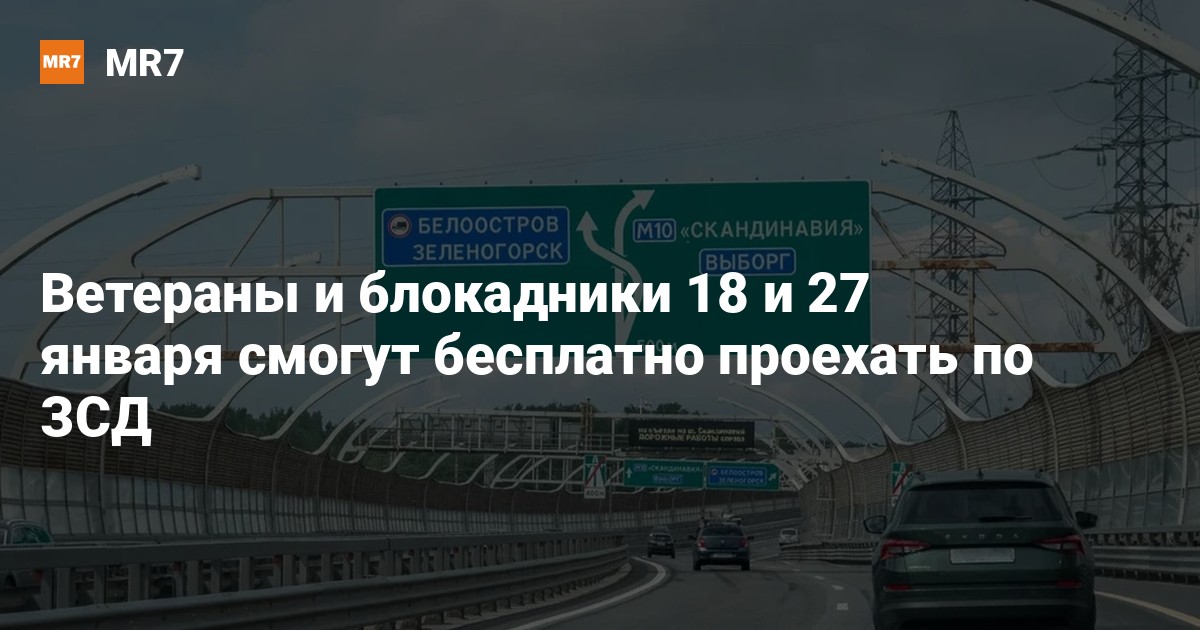 Для ветеранов и блокадников Великой Отечественной войны, а также для сопровождающих их лиц Западный скоростной диаметр (ЗСД) станет бесплатным 18 и 27 января — с 00:00 до 23:59, сообщили в пресс-службе компании «Магистраль Северной столицы».