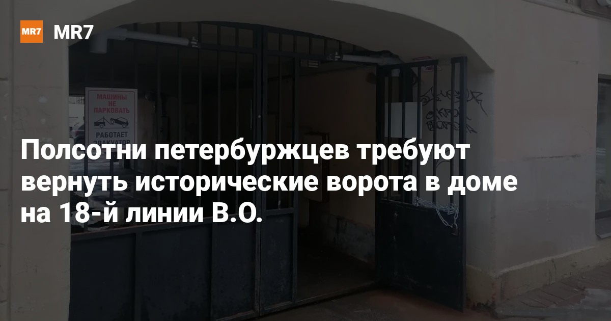 Петербургские градозащитники обратились к главе СК Александру Бастрыкину и главному прокурору Петербурга Виктору Мельнику с просьбой вмешаться в ситуацию на 18-й линии В.О., где жильцы дома № 13 самовольно заменили ворота. Силовиков просят инициировать проверку и добиться возвращения исторических ворот в арку более 50 активистов, жителей дома и соседей.