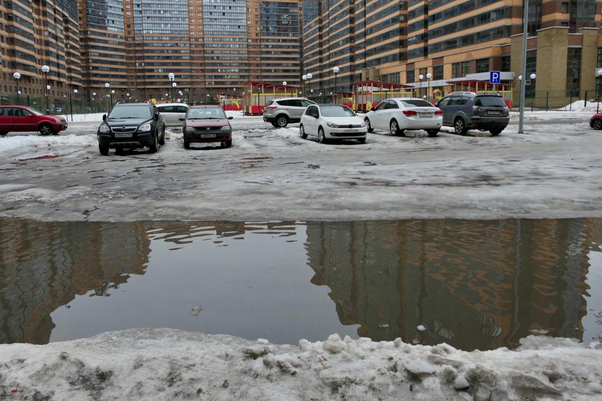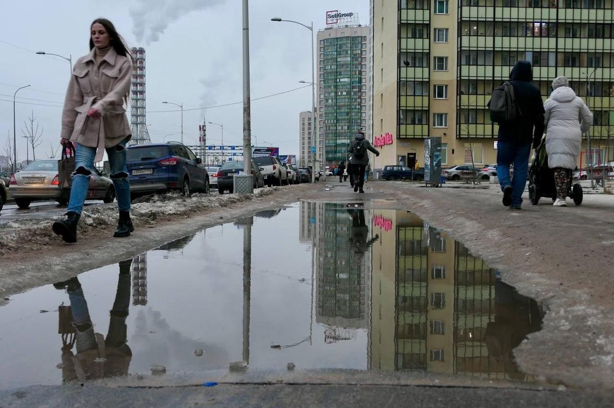 Из-за потепления, которое держится в течение нескольких дней, на дорогах и тротуарах Петербурга и Ленобласти образовались лужи, больше напоминающие озёра.