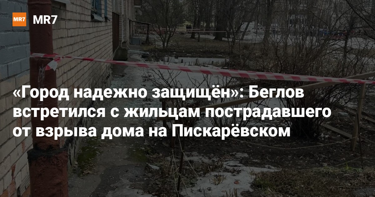 На место взрыва беспилотника на Пискарёвском проспекте приехал губернатор Петербурга Александр Беглов. Сначала он прошел к оцепленному силовиками дому, а затем встретился с жильцами пострадавшего дома, которых временно разместили в близлежащем детском саду.