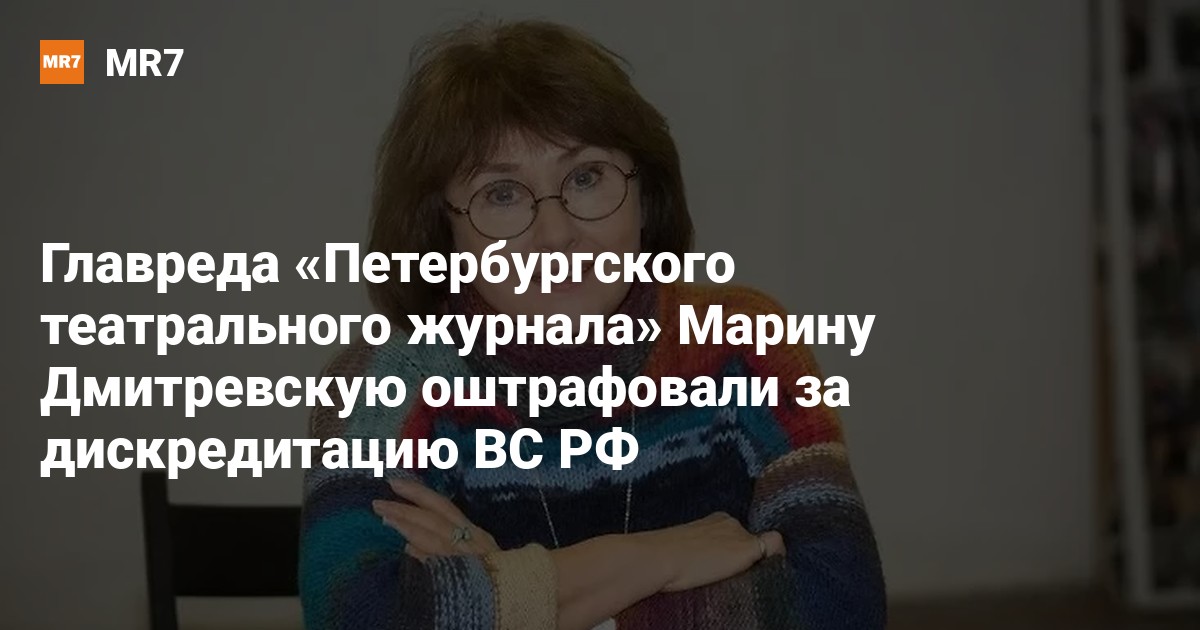 Главного редактора «Петербургского театрального журнала» Марину Дмитревскую оштрафовали на 30 тысяч рублей за дискредитацию Вооруженных сил РФ, следует из данных на сайте Дзержинского районного суда Петербурга.