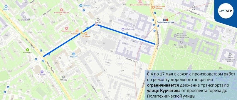 Кроме того, до 17 мая в связи с работами по ремонту дорожного покрытия ограничат движение по улице Курчатова — от проспекта Тореза до Политехнической улицы.