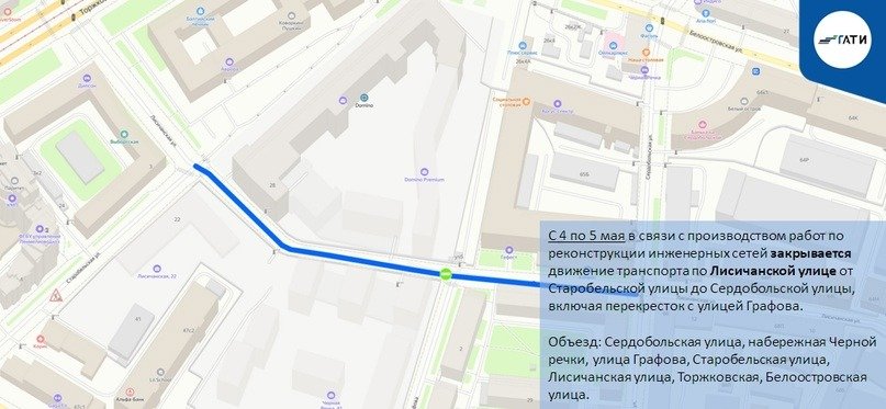 До 5 мая из-за работ по реконструкции инженерных сетей закрывается движение по Лисичанской улице — от Старобельской улицы до Сердобольской улицы, включая перекресток с улицей Графова.