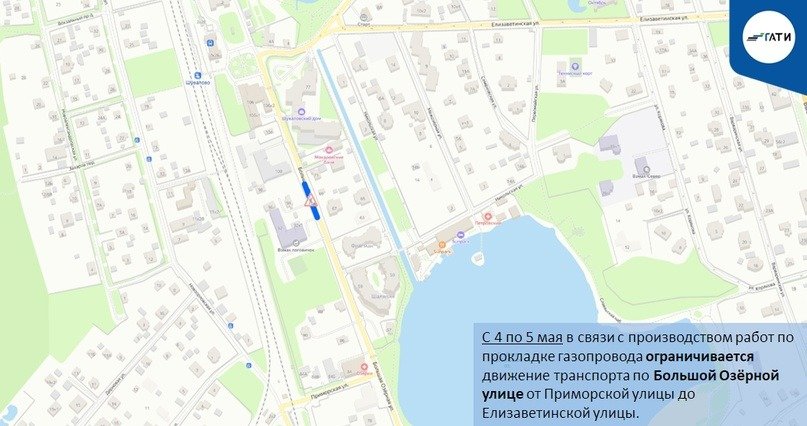 Из-за работ по прокладке газопровода до 5 мая будет ограничено движение транспорта по Большой Озёрной улице — от Приморской улицы до Елизаветинской улицы.