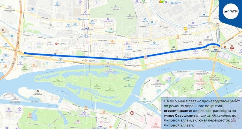 Кроме того, в связи с работами по ремонту дорожного покрытия до 5 мая ограничивается движение транспорта по улице Савушкина — от улицы Оскаленко до Липовой аллеи, включая перекресток с Липовой аллеей.