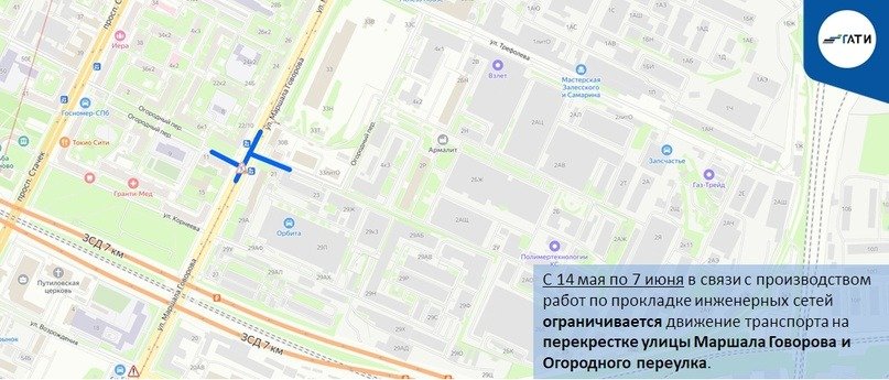 Из-за работ по прокладке инженерных сетей с 14 мая по 7 июня ограничивается движение транспорта на перекрестке улицы Маршала Говорова и Огородного переулка.