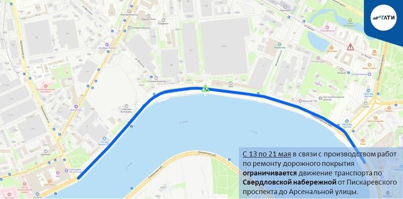 С 13 по 21 мая из-за работ по ремонту дорожного покрытия будет ограничено движение транспорта по Свердловской набережной — от Пискаревского проспекта до Арсенальной улицы.