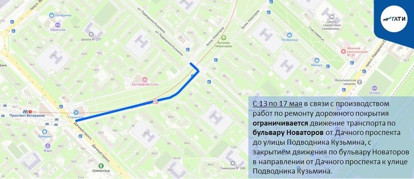 С 13 по 17 мая в связи с работами по ремонту дорожного покрытия ограничивается движение по бульвару Новаторов — от Дачного проспекта до улицы Подводника Кузьмина, с закрытием движения по бульвару Новаторов в направлении от Дачного проспекта к улице Подводника Кузьмина.