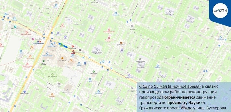 Также в связи с работами по реконструкции газопровода с 13 по 15 мая (в ночное время) ограничат движение по проспекту Науки — от Гражданского проспекта до улицы Бутлерова.