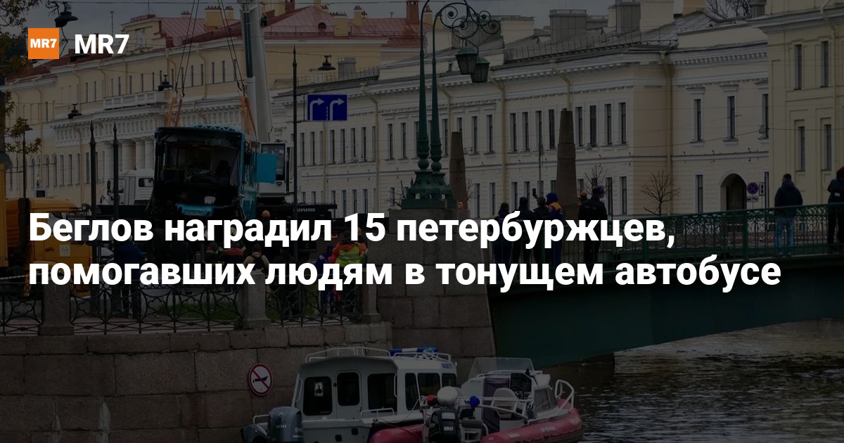 Губернатор Петербурга Александр Беглов наградил 15 петербуржцев, помогавших доставать людей из рухнувшего в Мойку 10 мая автобуса, сообщает «Фонтанка».