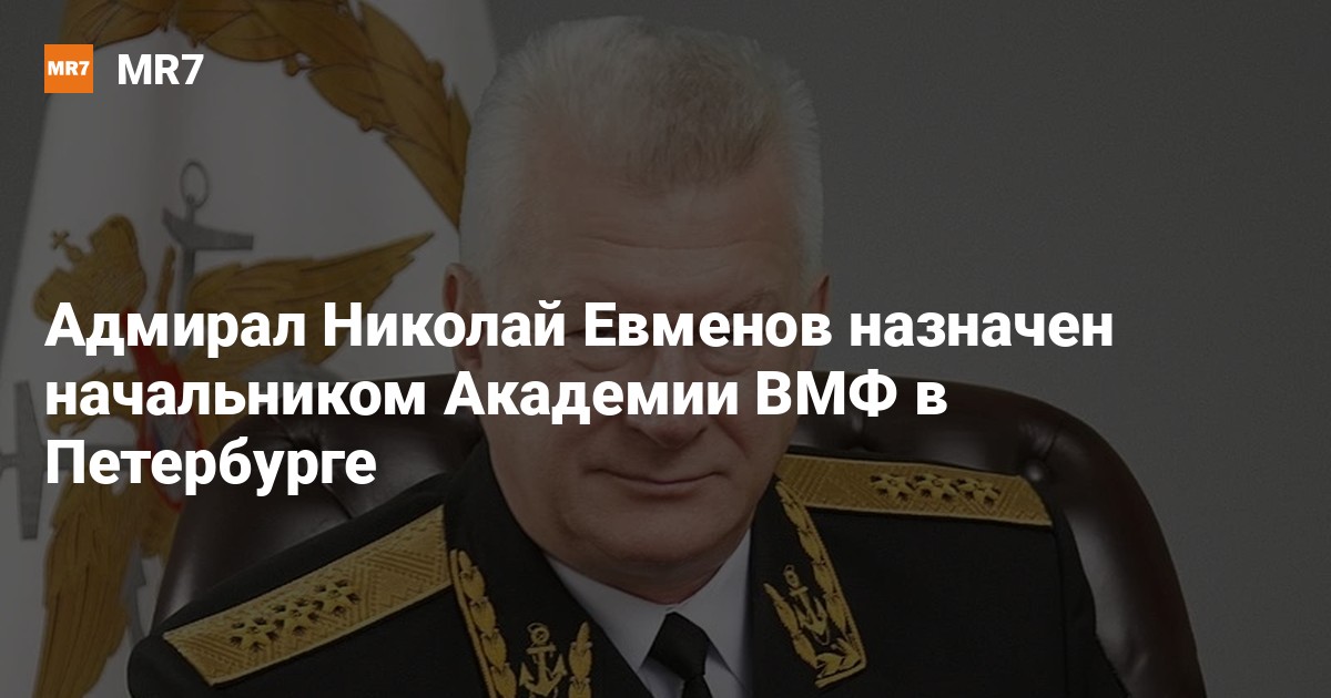 Бывший главнокомандующий Военно-морского флота адмирал Николай Евменов назначен руководителем Академии ВМФ РФ в Петербурге, сообщает «Фонтанка».