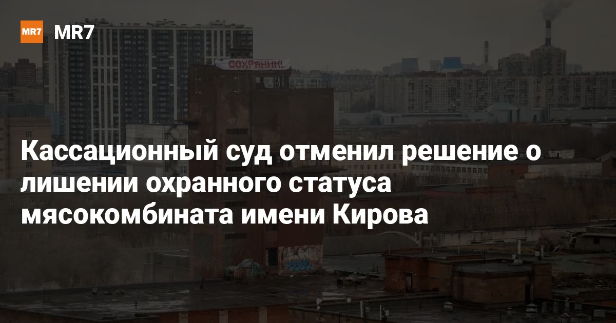 Арбитражный суд Северо-Западного федерального округа в третьей кассационной инстанции отменил решения судов о лишении мясокомбината имени Кирова охранного статуса объекта культурного наследия, сообщили в Telegram-канале «SOS СПб СНОС».