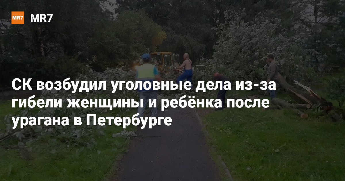 Следственный комитет возбудил уголовные дела в связи с гибелью женщины и ребёнка в Московском и Красногвардейском районах Петербурга — они стали жертвами прошедшего накануне урагана. Об этом 2 июля сообщили в пресс-службе ГСУ СК РФ по городу.