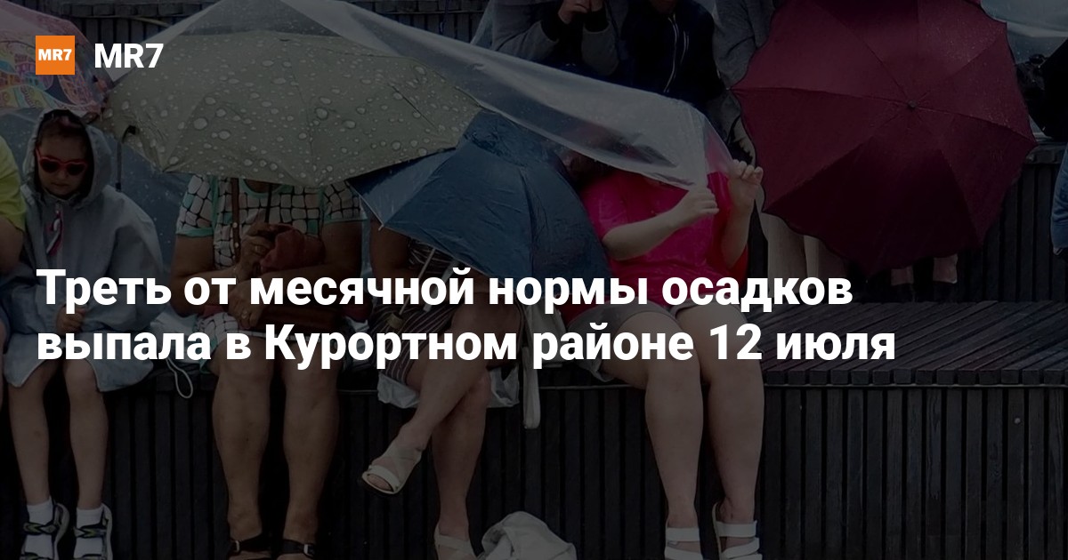 Треть от месячной нормы осадков выпала в Курортном районе Петербурга 12 июля, рассказали в пресс-службе ГУП «Водоканал Санкт-Петербурга». Там зафиксировали сверхрасчётный дождь интенсивностью 8,47 миллиметров за 20 минут — всего в районе выпало 24,98 миллиметров осадков.