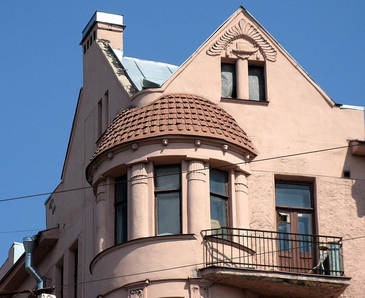 «Основным акцентом со стороны Малой Разночинной улицы является отодвинутая от угла четырёхгранная башенка, вырастающая над соседним шестиэтажным корпусом. Узкие окна и высокая сложной формы кровля придают башенке романтический вид, напоминая о рыцарских замках», — отмечают специалисты КГИОП.