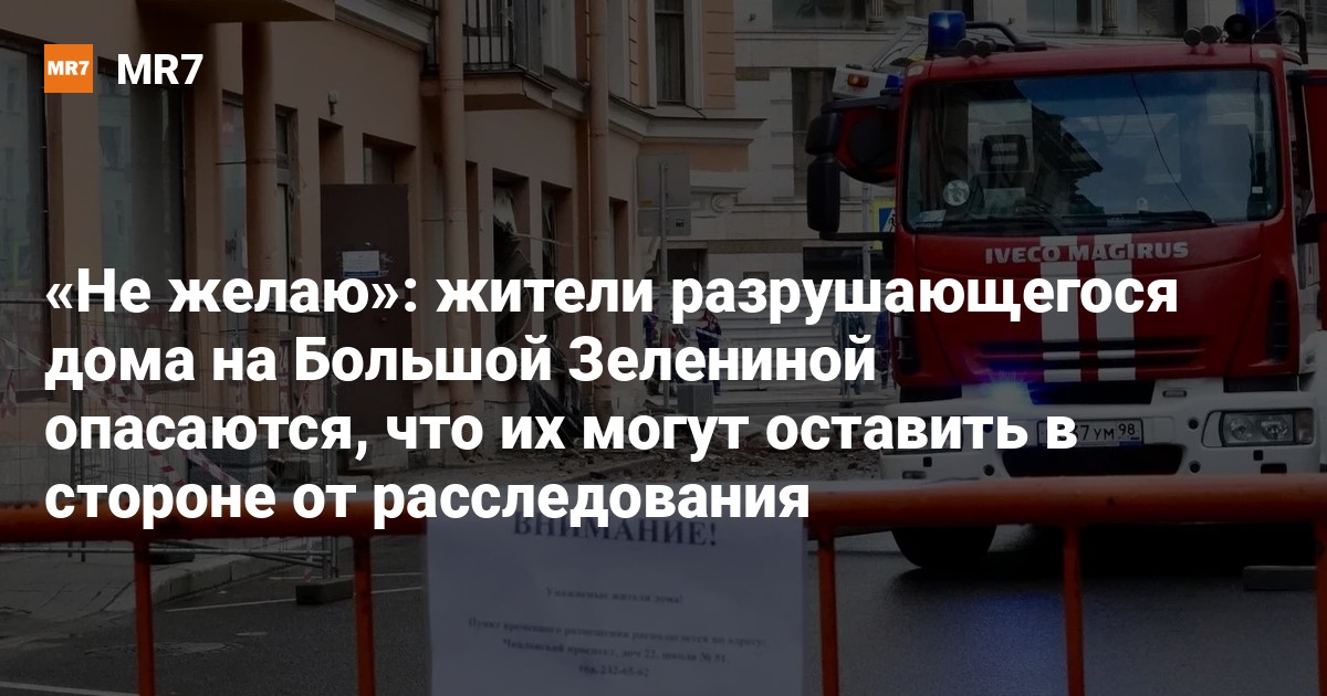 Пострадавшие в результате обрушения несущей стены дома № 1/44 по Большой Зелениной улице жители дали показания в следственном отделе по Петроградскому району. Среди заявлений, которые они подписывали во время допроса, форма одного из документов вызвала у людей вопросы — графы для ответов уже были заполнены так, чтобы люди остались «не при деле» в этом расследовании. «Не желаю» воспользоваться правом на ознакомление с документами, о продлении сроков «не уведомлять», гражданский иск подавать на стадии предварительного следствия тоже «не желаю» — следует из предупредительно заполненных граф в заявлении.