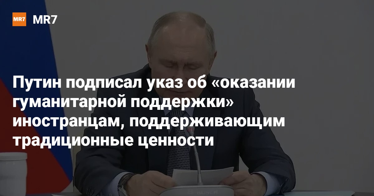 Президент России Владимир Путин подписал указ «Об оказании гуманитарной поддержки лицам, разделяющим традиционные российские духовно-нравственные ценности». Соответствующий документ появился 19 августа на официальном портале правовой информации.