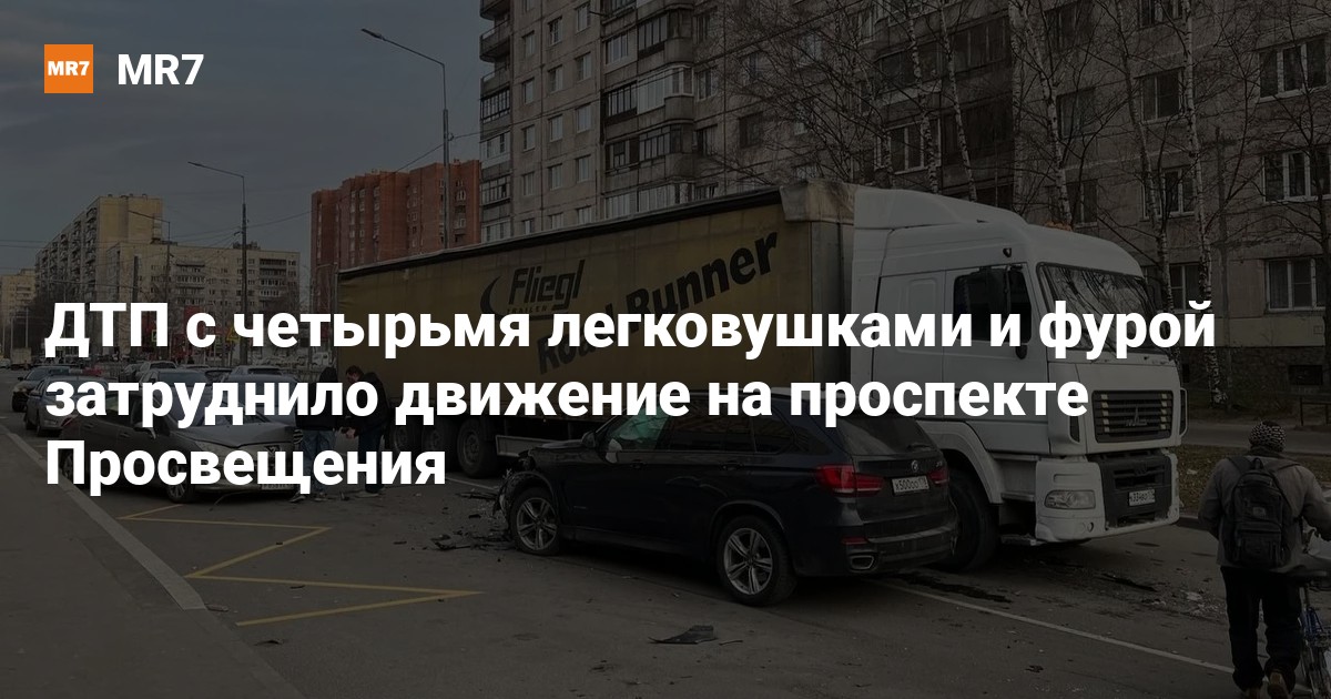 В Петербурге на пересечении проспекта Просвещения и улицы Ивана Фомина произошло ДТП с четырьмя легковушками и фурой. Массовое столкновение машин стало причиной долгой пробки. Фото последствий аварии поделились очевидцы в соцсетях.