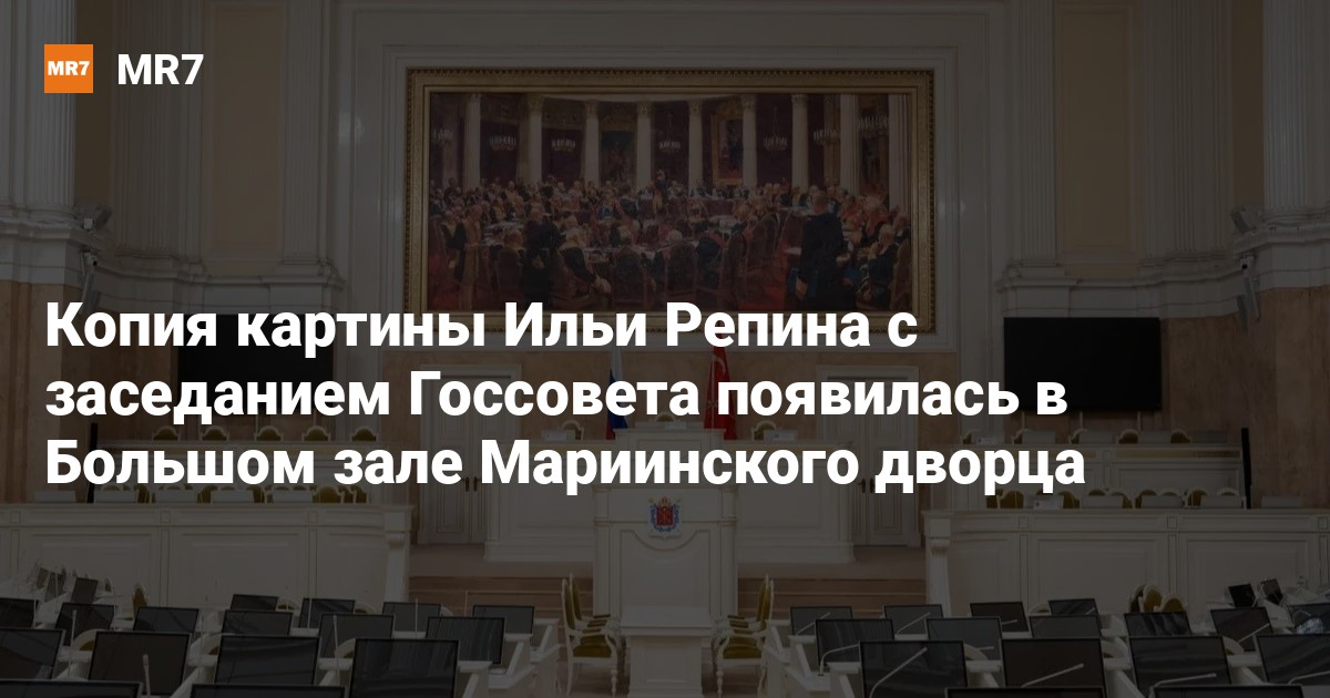 Картина Ильи Репина «Торжественное заседание Государственного совета 7 мая 1901 года» спустя 107 лет вернулась в Большой зал Мариинского дворца, где заседает ЗакС Петербурга. Точная копия картины стала подарком художника-урбаниста Олега Лукьянова к 30-летию городского парламента.