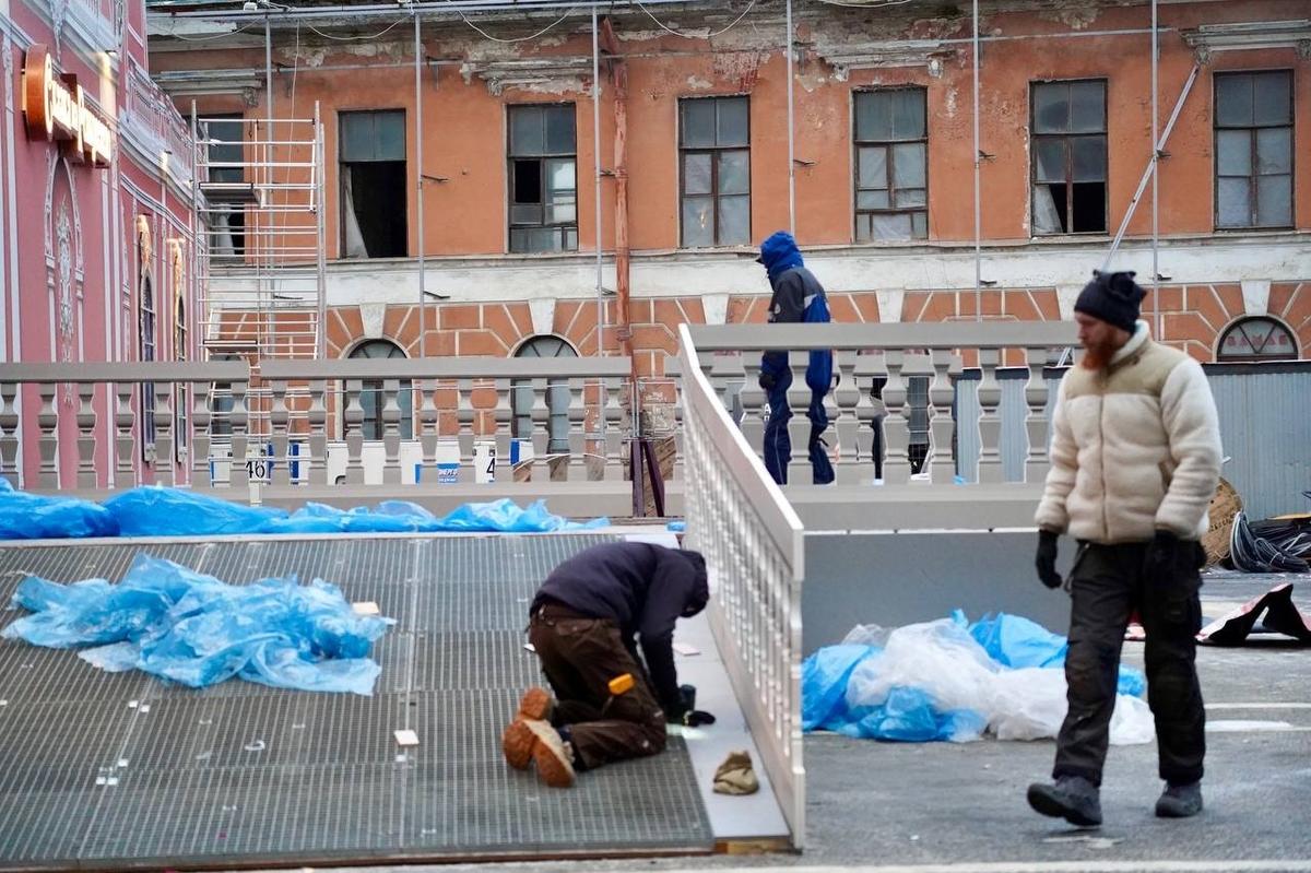 14 декабря на Конюшенной площади откроется каток. Но баннеры убрали не из-за него. В КГИОП объяснили «Фонтанке», что баннеры сняли для обмеров в рамках разработки проекта реставрации.