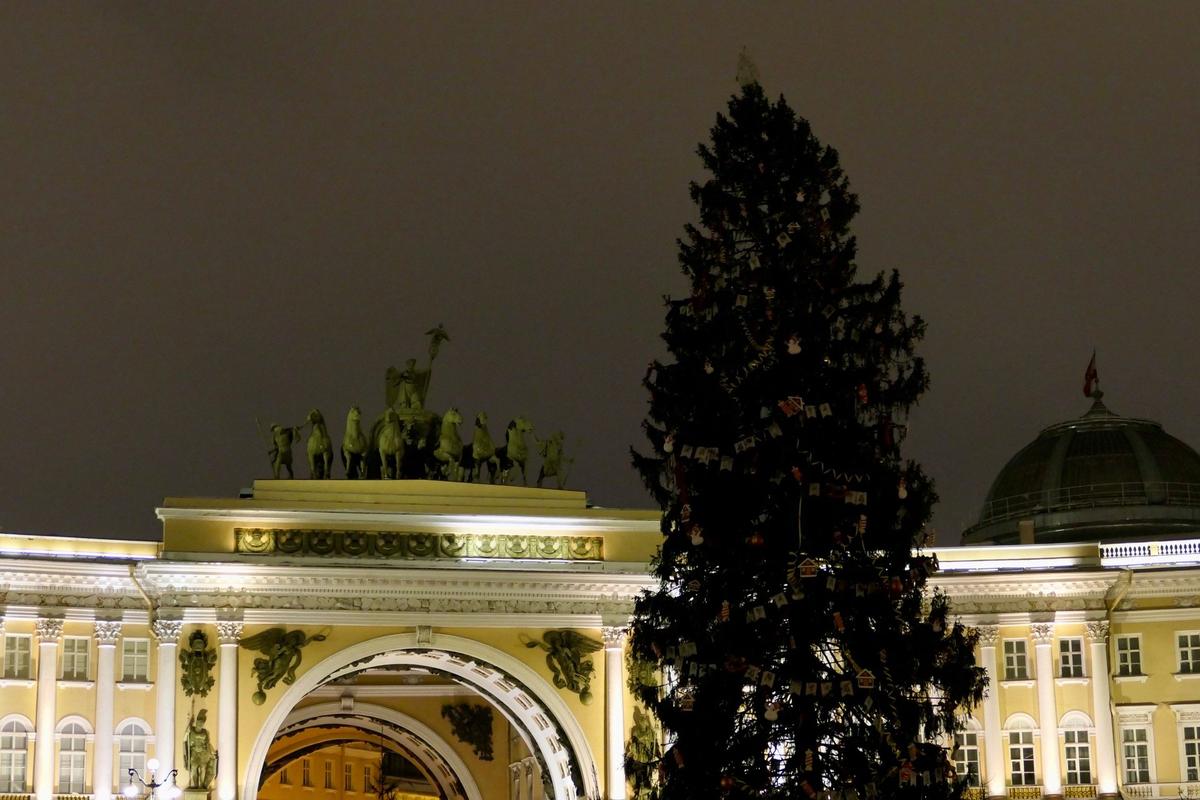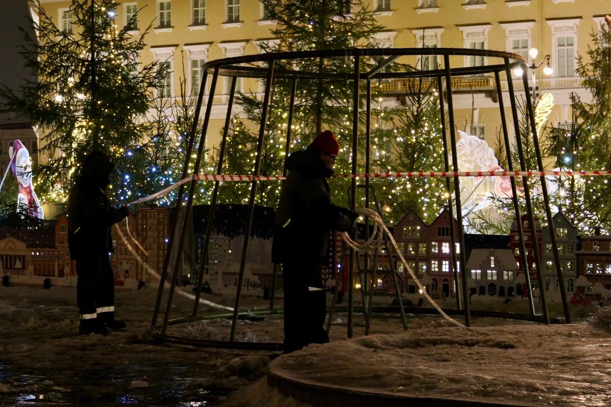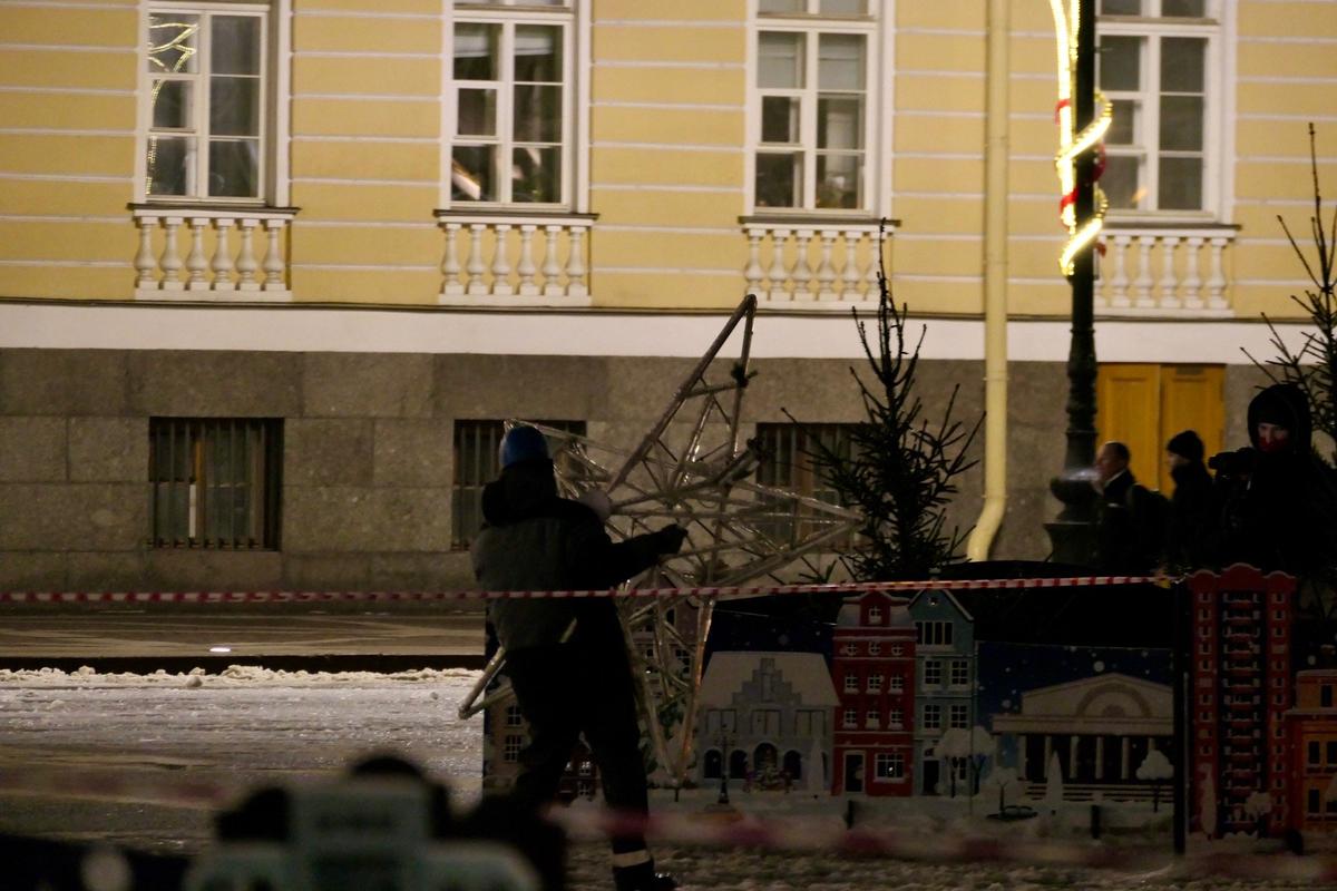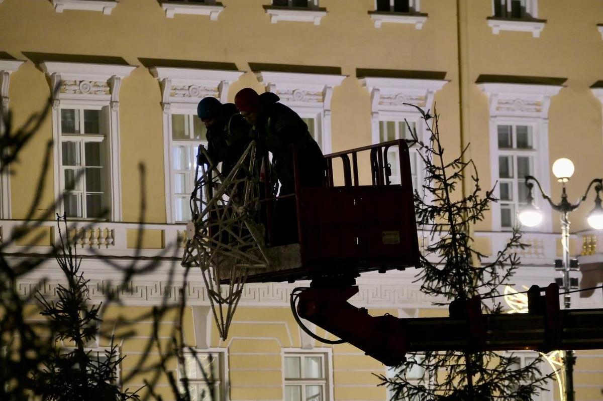 В ночь на 15 января на Дворцовой площади начали демонтировать праздничное дерево. Этот процесс займет примерно неделю. Пока же отключили новогоднюю иллюминацию и сняли с макушки ёлки звезду.