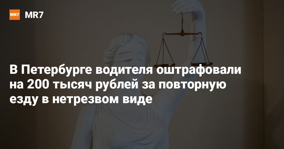 В Петербурге Московский районный суд вынес приговор мужчине по уголовному делу по части 1 статьи 264.1 УК РФ (управление транспортом в состоянии опьянения лицом, подвергнутым административному наказанию). За повторную езду в нетрезвом виде его приговорили к штрафу в 200 тысяч рублей.