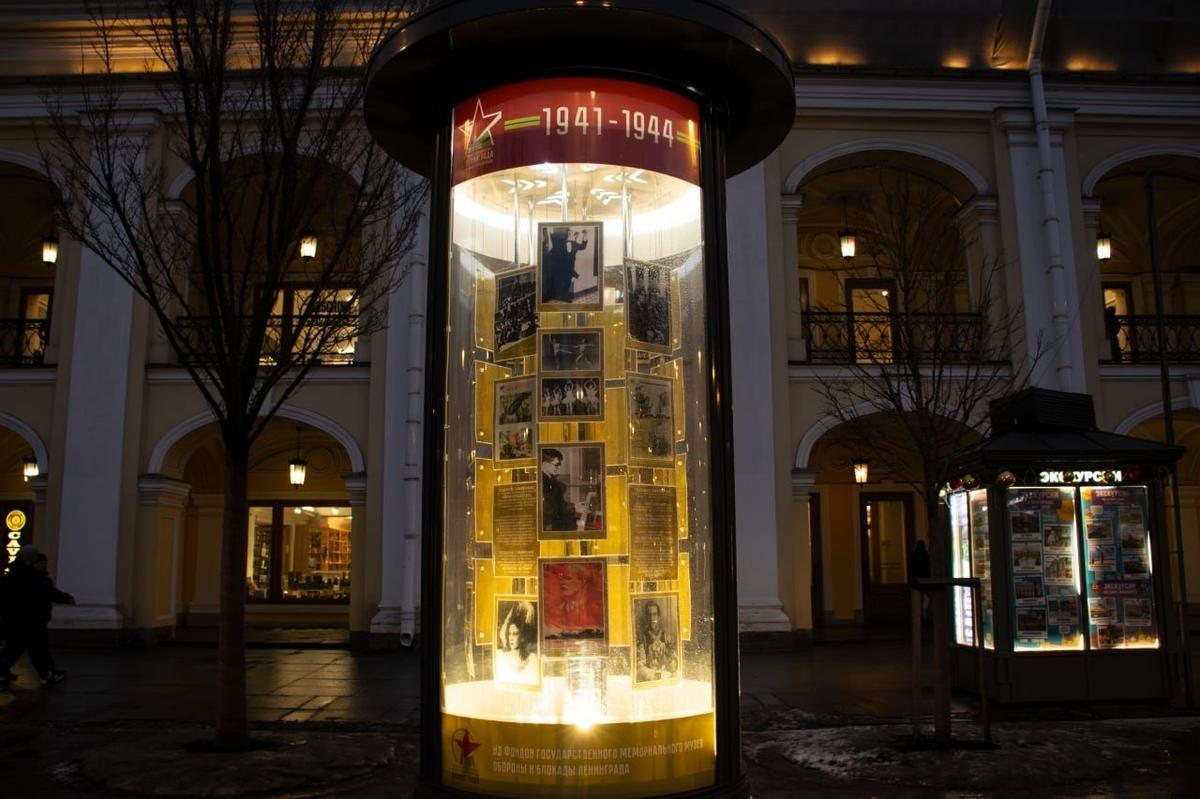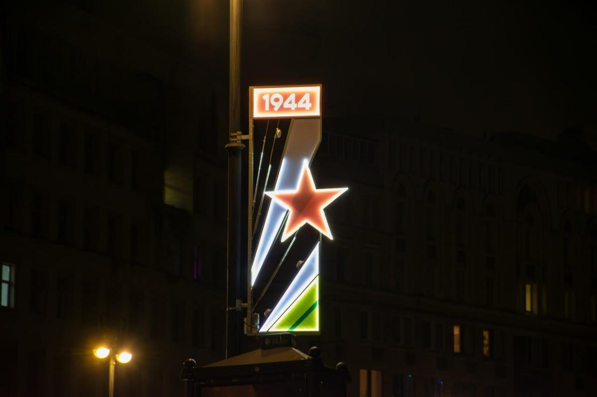 Вдоль набережных появились неоновые изображения памятных дат и символов мира. На Невском проспекте выставляются архивные фотографии из фондов Государственного мемориального музея обороны и блокады Ленинграда.