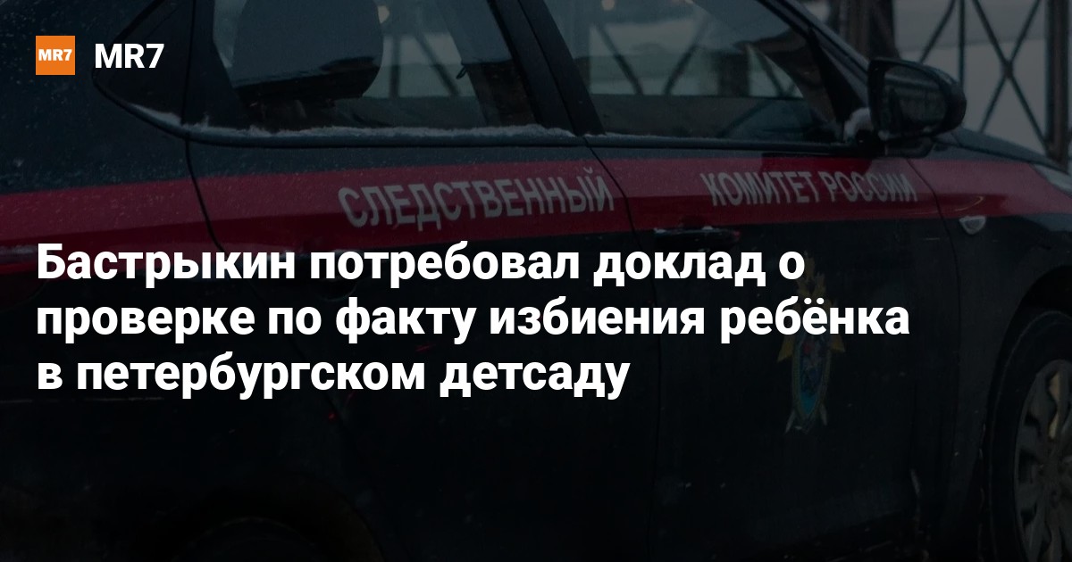 ГСУ СК России по Петербургу проводит проверку по факту причинения телесных повреждений ребёнку в одном из детсадов города. Доклад о её результатах у и. о. руководителя городского ведомства Олега Бобкова запросил глава СКР Александр Бастрыкин, сообщила пресс-служба петербургского СК.