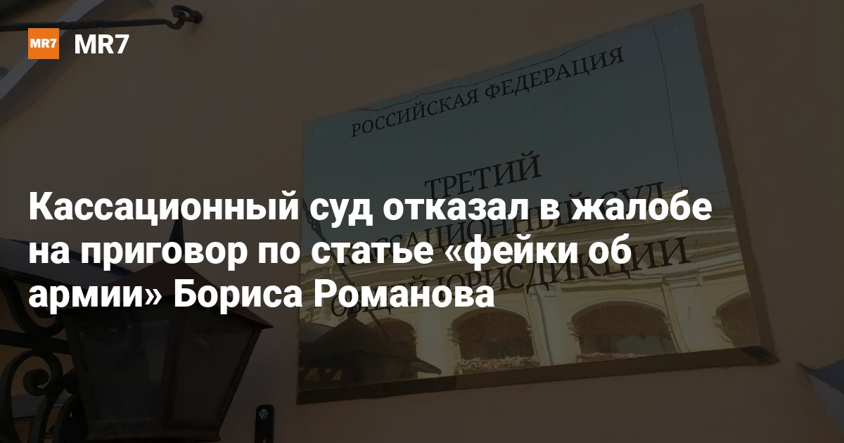 Третий кассационный суд 6 марта рассмотрел жалобу на приговор петербургского активиста Бориса Романова, заочно осуждённого по статье 207.3 УК РФ — «фейки об армии». Сам Борис остаётся за границей. С приговором не согласен. В отличие от тройки судей. Жалобу оставили без удовлетворения, приговор (шесть лет колонии) — в силе.