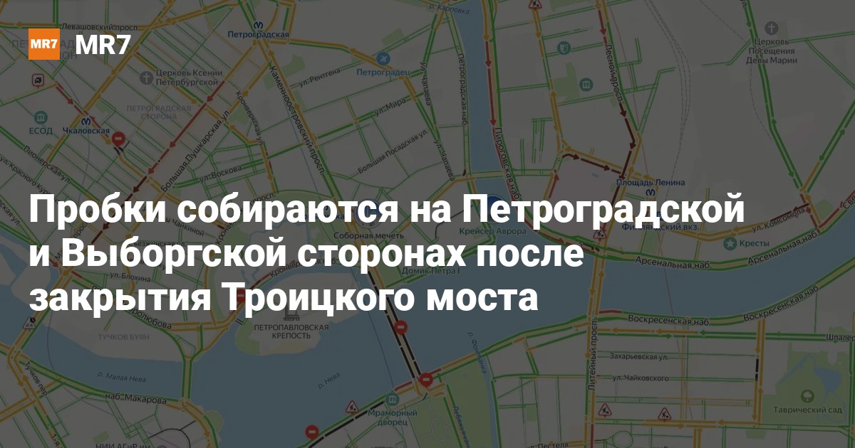 Троицкий мост с 1 апреля закрыт для автомобилей из-за ремонта трамвайных путей и дорожного полотна. По данным «Яндекс Карт» на 8:00, в Петербурге уже растут пробки на Выборгской и Петроградской сторонах.