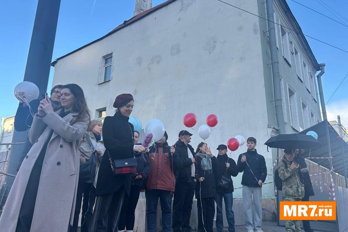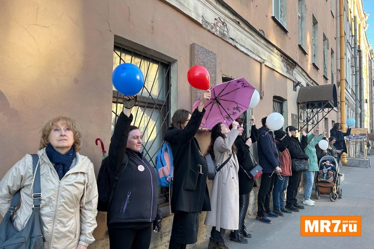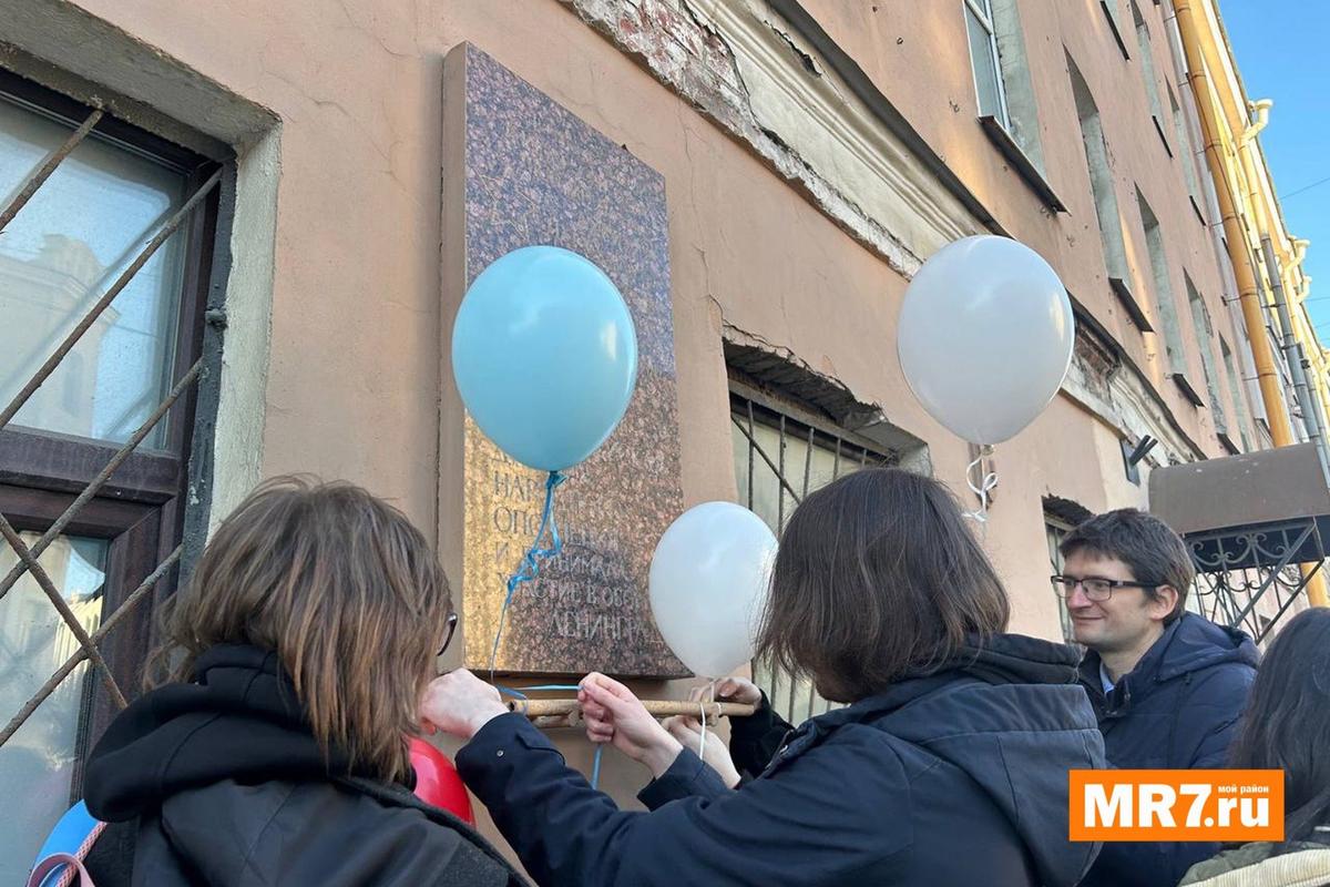 Шарики активисты оставили у мемориальной доске на школе, где училась Берггольц. Фото: Дарья Дмитриева / MR7