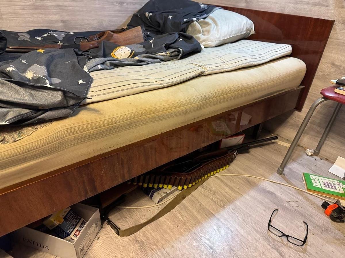 Подозреваемого задержали в своем доме полицейские. Он не оказывал сопротивления, так как был крепко пьян и провалился в сон. Всего в доме нашли пять охотничьих ружей.