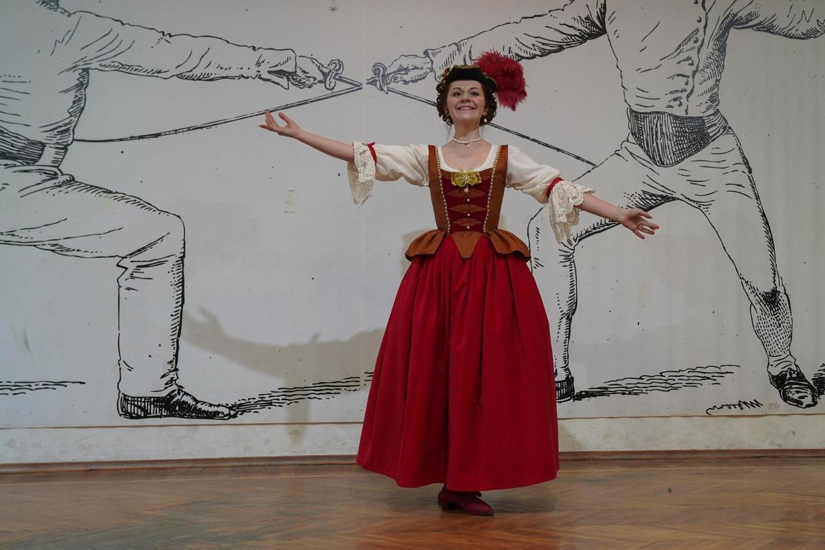 Поздравляли фехтовальный клуб с юбилеем руководитель театра танца «Монплезир» Анастасия Попова, исполнившая танец эпохи барокко, а также ученики школы классического фехтования «Плащ и шпага».