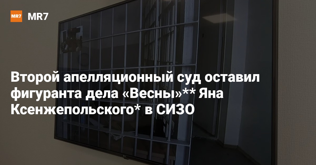 Во Втором апелляционном суде утром 8 апреля состоялось отложенное судебное заседание по апелляционной жалобе на меру пресечения одного из участников дела «Весны»** — Яна Ксенжепольского*. Жалобы других пяти обвиняемых — Анны Архипова*, Василия Неустроева*, Павла Синельникова*, Евгения Затеева* и Валентина Хорошенина* на решение Городского суда о продлении им срока содержания от 26 февраля под стражей на три месяца (до 13 июня) были рассмотрены 27 марта и все оставлены без удовлетворения. Адвокат Ксенжепольского* Татьяна Соломина не смогла 27 марта явиться на заседания по состоянию здоровья, поэтому, несмотря на возражения адвокатов остальных обвиняемых, заседание по жалобе Яна* было перенесено на 8 апреля.