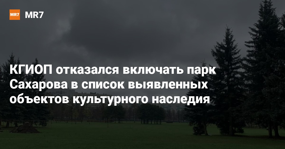 Комиссия КГИОП не рекомендовала включать парк Сахарова в перечень выявленных объектов культурного наследия. Парк останется в списке объектов зелёных насаждений общего пользования, сообщается на сайте КГИОП.