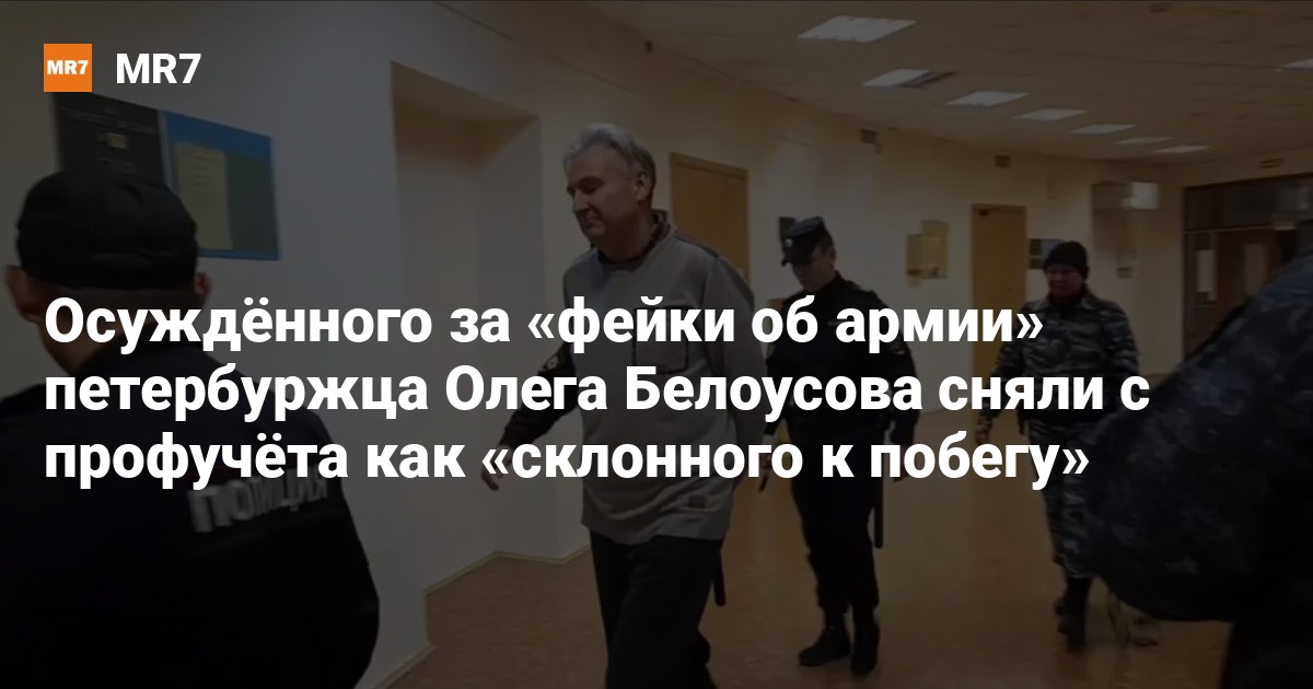 Петербургского поисковика Олега Белоусова, отбывающего в колонии срок по статьям о «фейках об армии» и о «призывах к экстремизму», сняли с профучёта как «склонного к побегу». Об этом сам осуждённый рассказал своим в письме, оно было опубликовано в его группе поддержки в Telegram 16 мая.