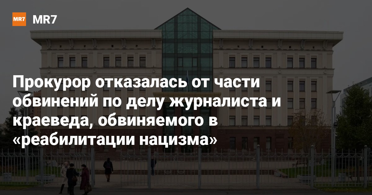 На заседании 11 июня в Горсуде Петербурга прокурор отказалась от части обвинений в связи с отсутствием состава преступления по делу историка и краеведа Дмитрия Витушкина. До сегодняшнего дня подсудимому вменялись преступления по статье о «реабилитации нацизма» (пункт «в» части 2 и части 4 статьи 354.1 УК РФ) за несколько комментариев в ВК.