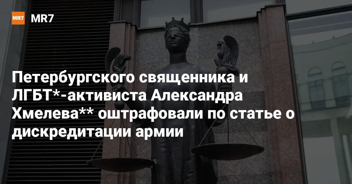 Ленинский районный суд Петербурга 11 июля оштрафовал священника и ЛГБТ*-активиста Александра Хмелева** на 30 тысяч рублей по части 1 статьи 20.3.3 КоАП РФ (дискредитация Вооружённых сил РФ). Об этом нашему изданию сообщила глава объединённой пресс-службы судов города Дарья Лебедева.