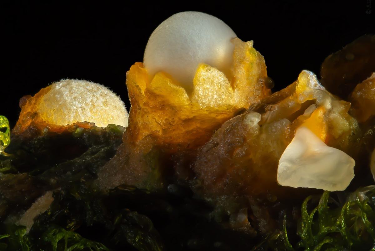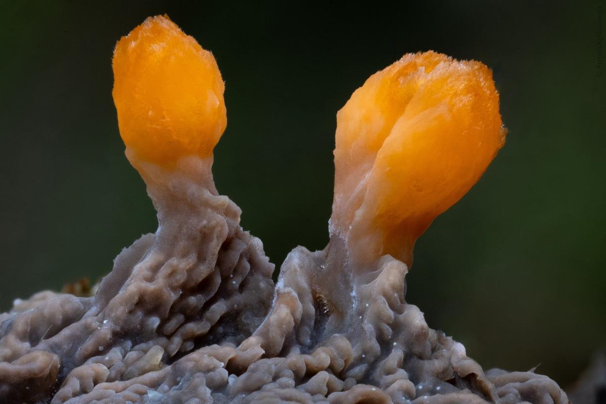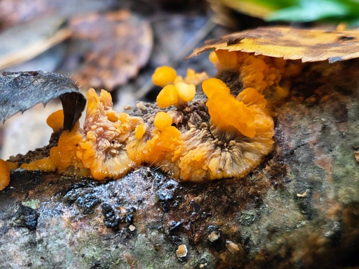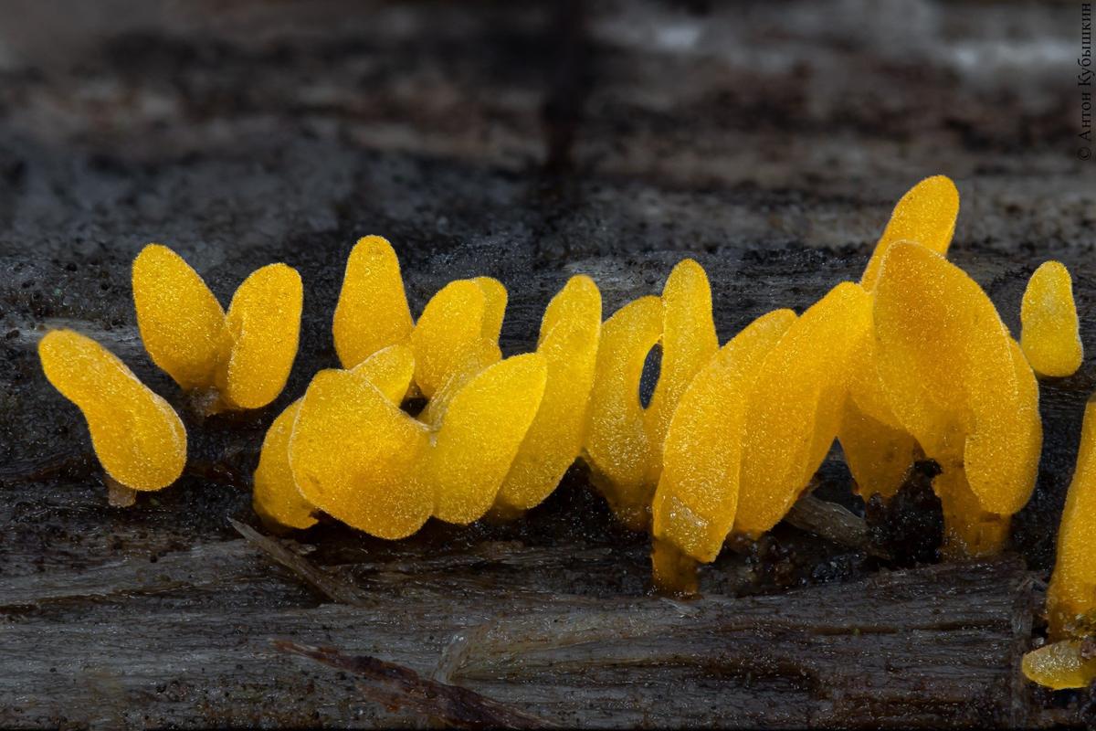— Мне многие интересны. И не только грибы. Сюда могут попадать и лишайники, и миксомицеты. Один получилось так интересно и необычно снять, что я даже делал шараду, загадку. Не помню, угадал в итоге кто-то или нет, что это. Но вроде бы не угадали. Хорошая была загадка. Это была флебия радиальная (Phlebia radiata). Её все видят, кто ходит в лес, но узнать по такому фото почти нереально. Дело все в том, что она выглядит не особо-то приятно, как крайне неаппетитный нарост на поваленном дереве.