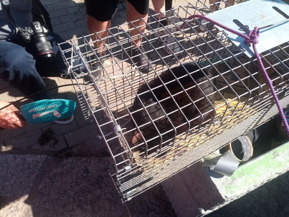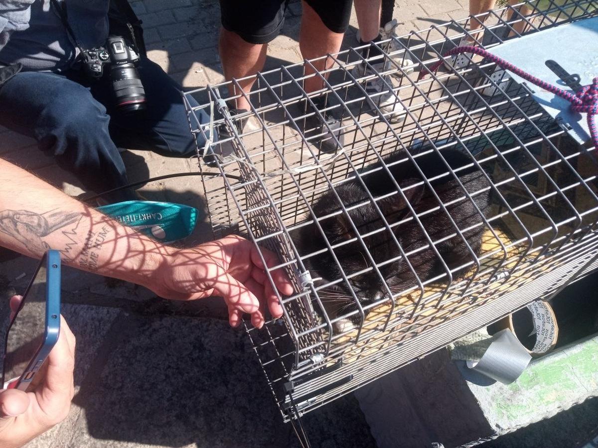 На этот раз вызволяли кота волонтеры с помощью клетки — ее прислонили к отверстию, где сидел пушистик. Одни спасатели держали её за тросы с набережной, другие — страховали на воде на сапе и наблюдали за животным, пытаясь приманить его в клетку кормом.