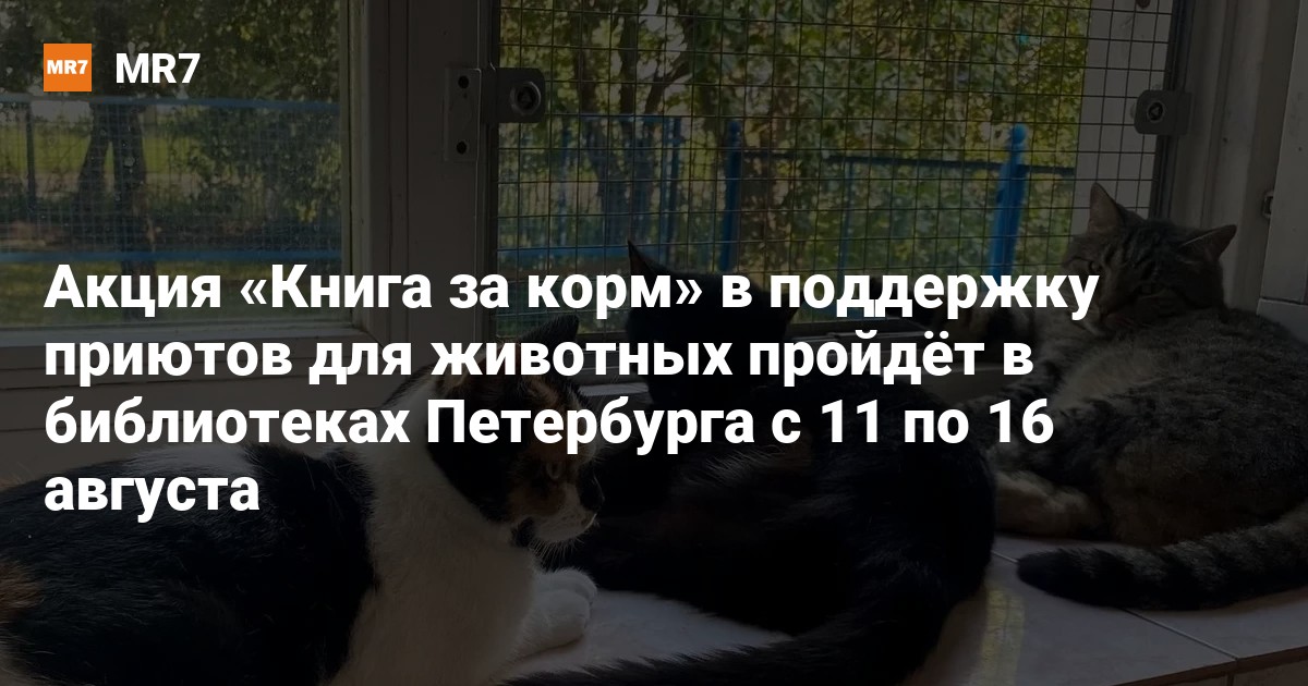 Ежегодная акция «Книга за корм», приуроченная ко Всемирному дню защиты бездомных животных, стартует в библиотеках Петербурга 11 августа. В течение недели в городские пространства можно будет приносить вещи, необходимые приютам для собак и кошек.
