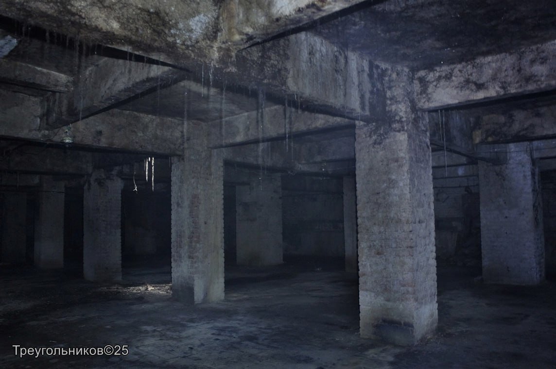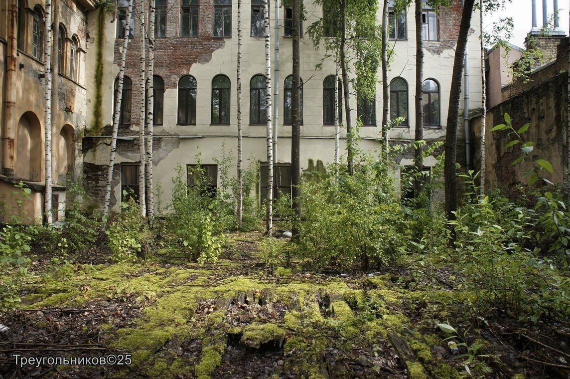 А ещё Треугольникову удалось попасть в небольшой «подвесной» двор. Теперь уже он скрывается под ковром из мха и разрастающихся молодого леска. Но под ними — подземелье, связанное в систему с подвалами и самого здания «Сберегательных касс», и с соседним двором. Такие дворы прежде были нередки в Петербурге — пространство под внутренним двором дома использовали как склады, кладовые.