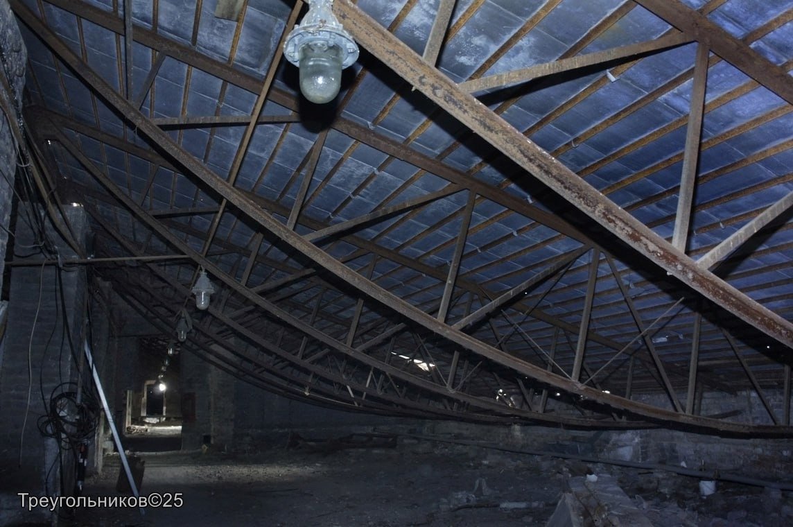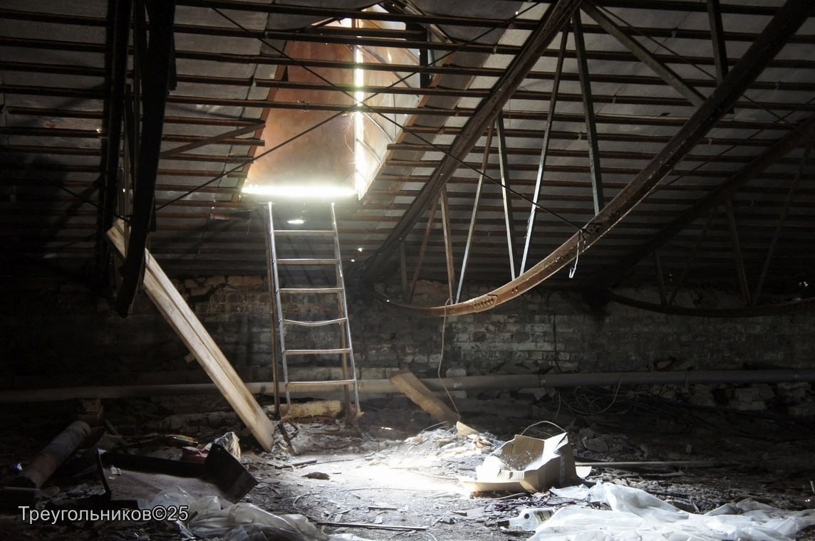 Александр заглянул в открытое здание, обошёл от подвала до крыши, обращая внимание не только на разруху — результат «вандализации» последних трёх лет, но и на те элементы, которые можно и нужно сберечь. Например, стропильная система чердака выполнена не из деревянного бруса, а из ажурных ферм из стального профиля на заклёпках.