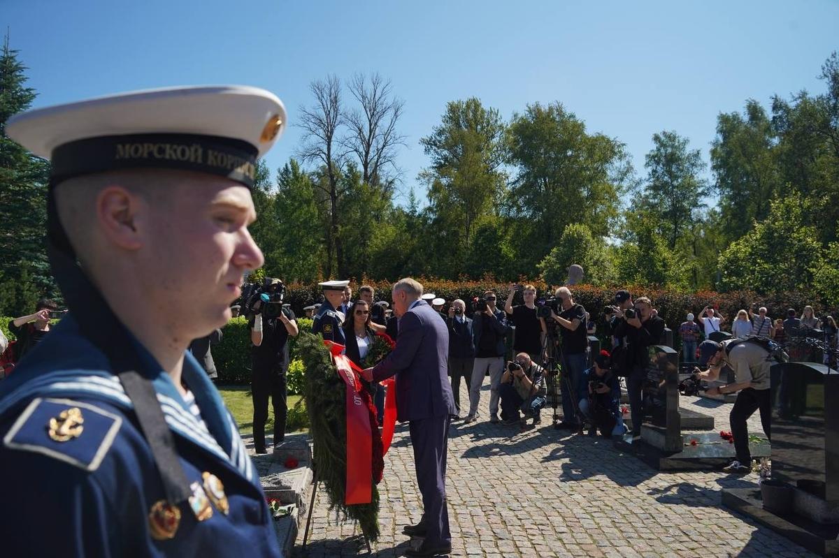 В 14:00 церемония возложения цветов и отдания воинских почестей состоялась у мемориала подводникам на Серафимовском кладбище. Именно здесь похоронены 32 из 118 моряков, включая командира, капитана первого ранга Геннадия Лячина. Цветы возложил губернатор Петербурга Александр Беглов, от командования ВМФ — главнокомандующий, адмирал Александр Моисеев и заместитель главнокомандующего, адмирал Владимир Воробьёв.