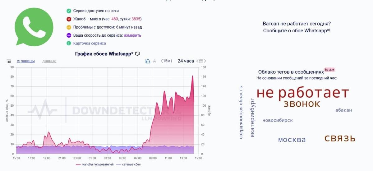 График сбоев WhatsApp* 11 августа. Скриншот: downdetector.info