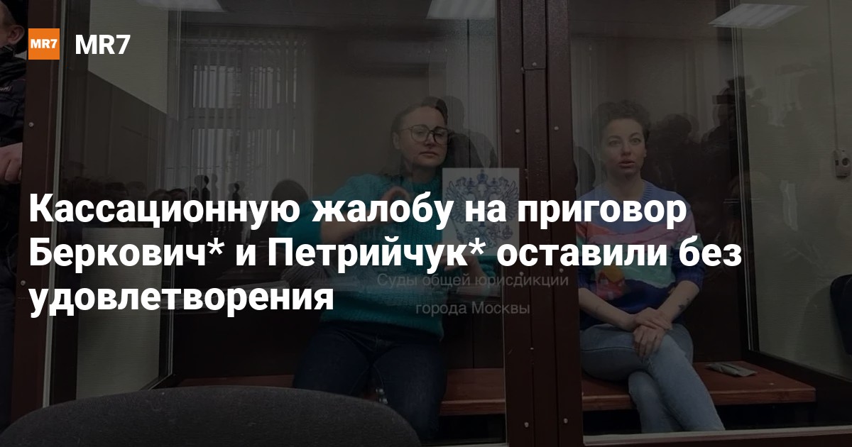 Верховный суд РФ 19 августа рассмотрел кассационную жалобу на приговор режиссеру Евгении Беркович* и драматургу Светлане Петрийчук* и оставил ее без удовлетворения. Отбываемые ими реальные сроки признали законными, передает РБК.