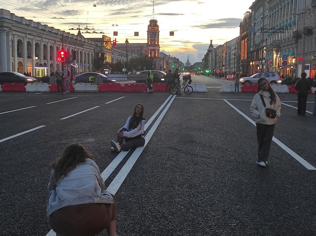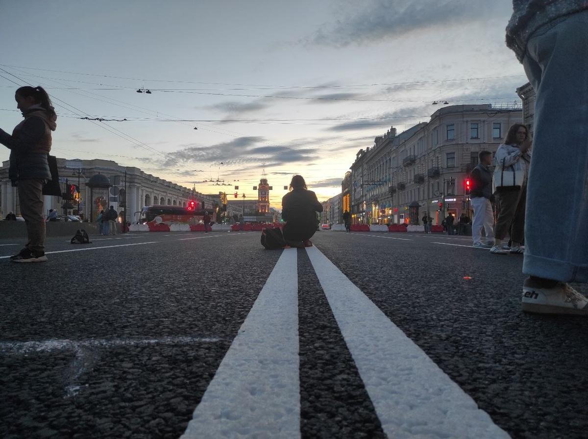 Невский проспект с 13 августа перекрывают из-за масштабного ремонта, но жизнь на нем не затихает. Люди по вечерам не только гуляют по перекрытой для машин улице, но и выходят с плакатами разного содержания.