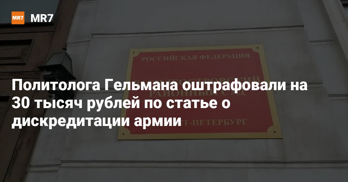 Василеостровский районный суд Петербурга признал виновным политолога Владимира Гельмана по статье 20.3.3 КоАП (дискредитация вооруженных сил РФ). Его оштрафовали на 30 тысяч рублей, сообщает 27 августа ЗАКС.Ру.