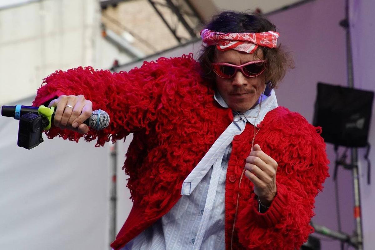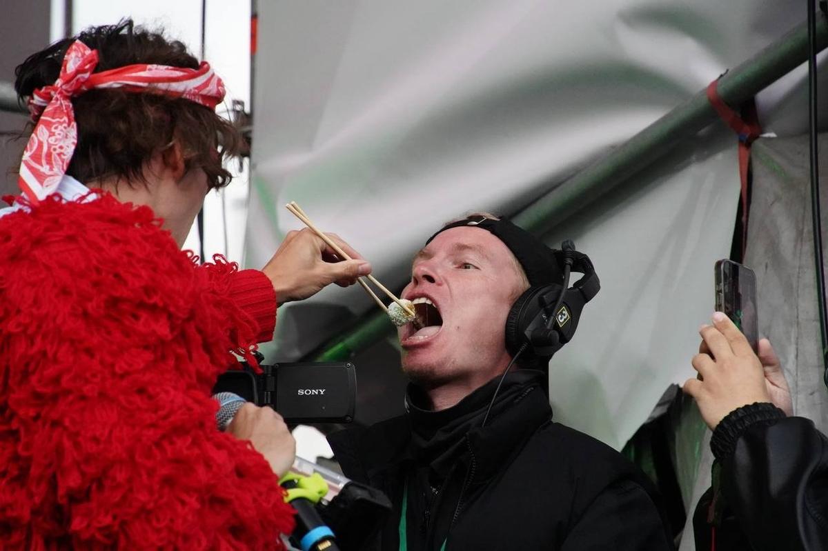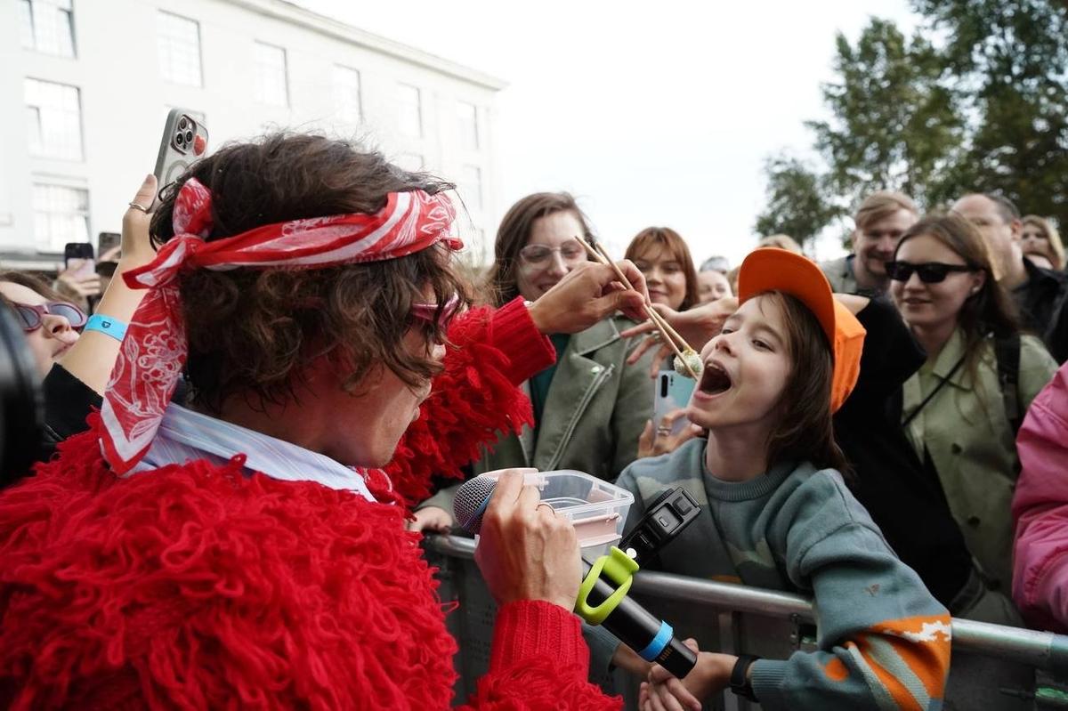 Неутомимый Антоха MC не только развлекал слушателей своими песнями, но и покормил. С рук исполнителя гости ели конфеты.