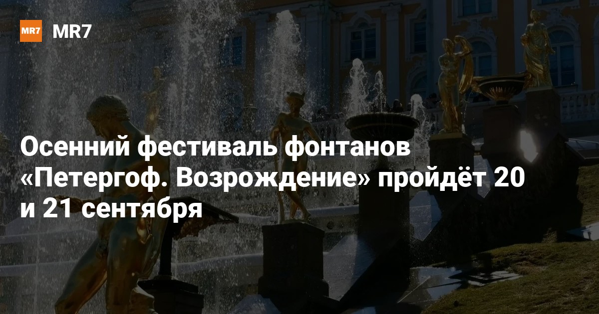 Осенний фестиваль фонтанов пройдёт в Нижнем парке музея-заповедника «Петергоф» 20 и 21 сентября. Программа будет посвящена воссозданию дворцово-паркового ансамбля после оккупации во время Великой Отечественной войны.